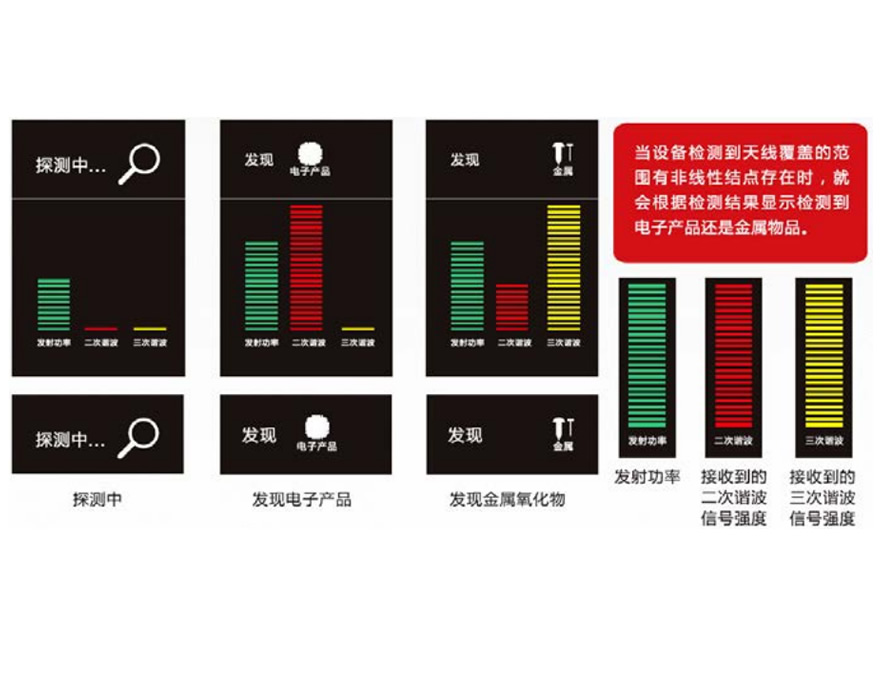原理:电子装置内都含有非线性节点(PN结),PN结在非线性节点探测器射频激励下,PN结会吸收激励信号,同时产生该信号的谐波也就是二次谐波。非线性节点探测器通过检测二次谐波的大小和变化规律,识别出带有非线性节点(PN结)的电子装置。电子装置(PN节)反射二次谐波 金属锈蚀物反射三次谐波